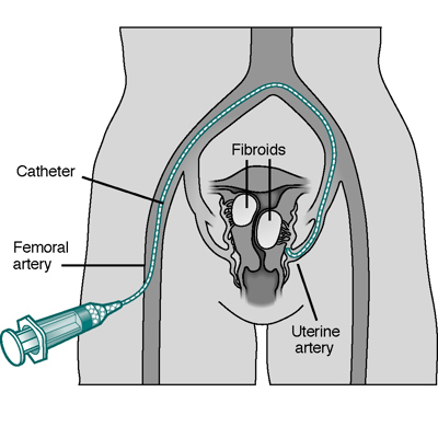 Under X-ray guidance and sedation, the interventional radiologist can access the blood vessel carrying nutrients to the tumor through a tiny incision in the wrist or groin. The IR then guides a very thin catheter or tube (about the size of a strand of spaghetti) from the incision through your blood vessels to the specific artery supplying blood to the fibroid.