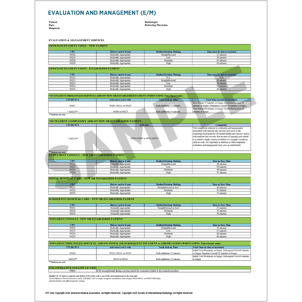 Musculoskeletal spine, pain management, biopsy/ drainage/ ablation, gastrointestinal and genitourinary, lower extremity revascularization, catheterization, angiograms and venograms, central venous catheter, evaluation and management, abdominal aortic aneurysm/thoracic aorta/ intrarenal aorta endovascular repair, and breast biopsy. The charge sheets are available in PDF format for download.