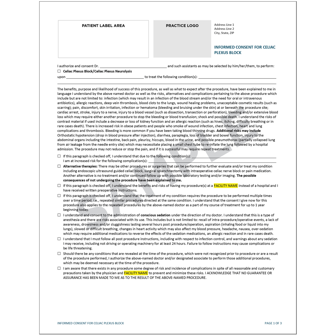 This informed consent document for interventional radiologists provides procedural benefits, purpose and likelihood of success of a procedure, as well as what to expect after the procedure, risks involved, alternatives and complications pertaining to a procedure.